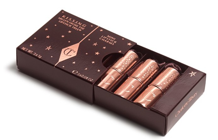 Charlotte Tilbury’s new Mini Lipstick Charms would make a lovely Christmas present for any makeup lover. They come in a pretty box.These little lipsticks are packaged in luxurious gold cases. They are mini versions of Charlotte’s top quality K.I.S.S.I.N.G shades, in pretty Penelope Pink, Bitch Perfect, and the classic red So Marilyn. The light-diffusing particles give the lips a full-bodied three dimensional finish. The ingredients are high quality and won’t feel chalky or dry to wear. They include a protective UV-shielding coating. The Mini Lipsticks charms cost £ 29.00 and available from www.charlottetilbury.com.